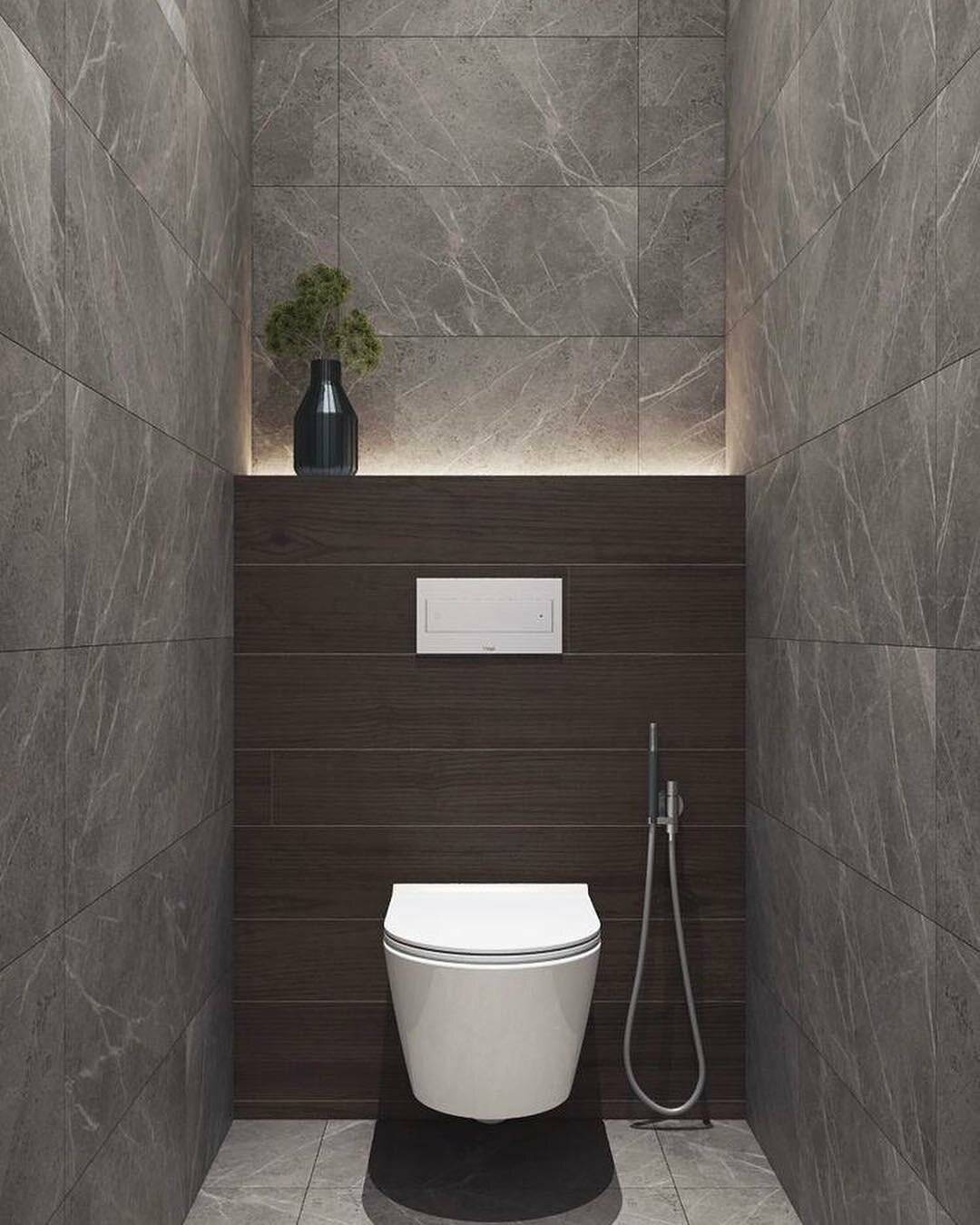 В дизайне маленького туалета не стоит забывать о подвесных унитазах – они отлично экономят место, что хорошо видно на фото.