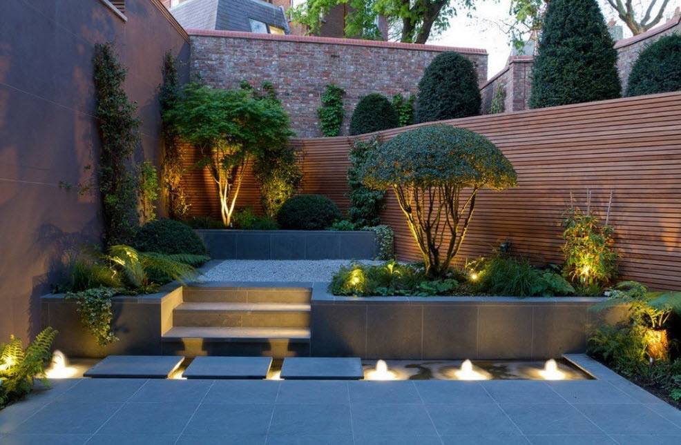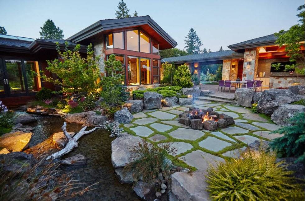 Японский стиль. Ключевым элементом является небольшой сад, который скрыт от чужих глаз, создает атмосферу умиротворения и покоя. Также возле зоны отдыха нужно расположить искусственный водоем с маленьким мостиком, дополнив картинку хвойными деревьями и светильниками (фонариками) оригинальной формы.