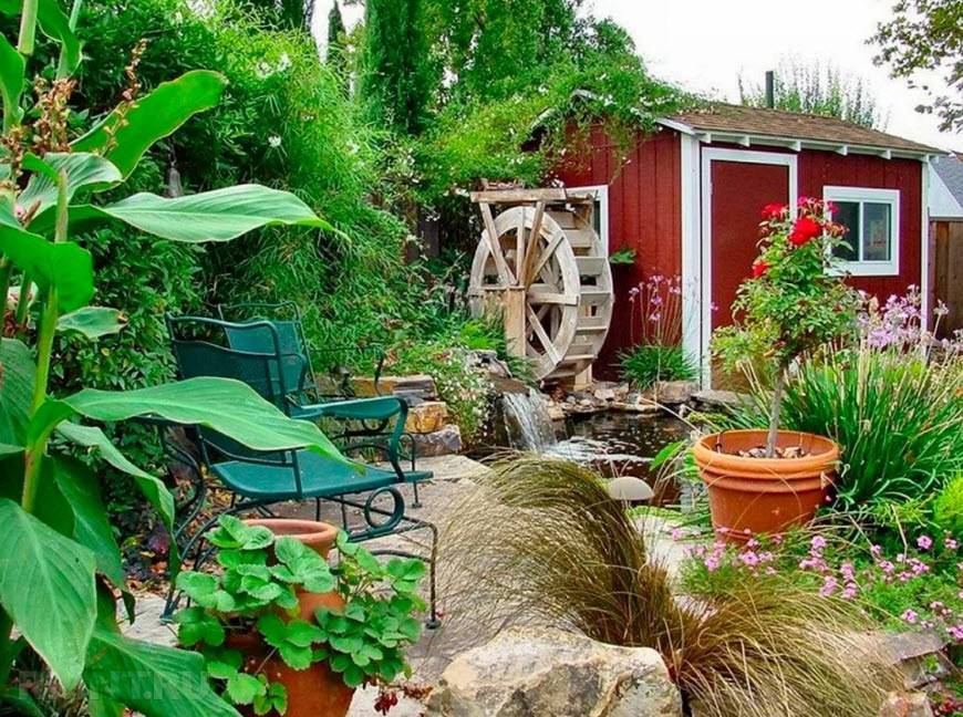 Сельская усадьба – стиль, который предполагает наличие предметов, встречающихся в повседневной сельской жизни: плетеные заборы и колодец, натуральные (грубые и массивные) камни и садовые статуэтки животных.