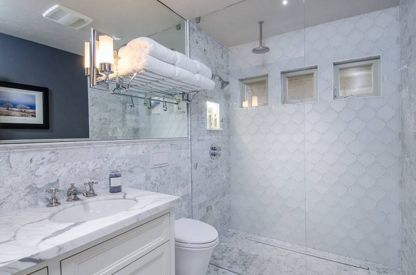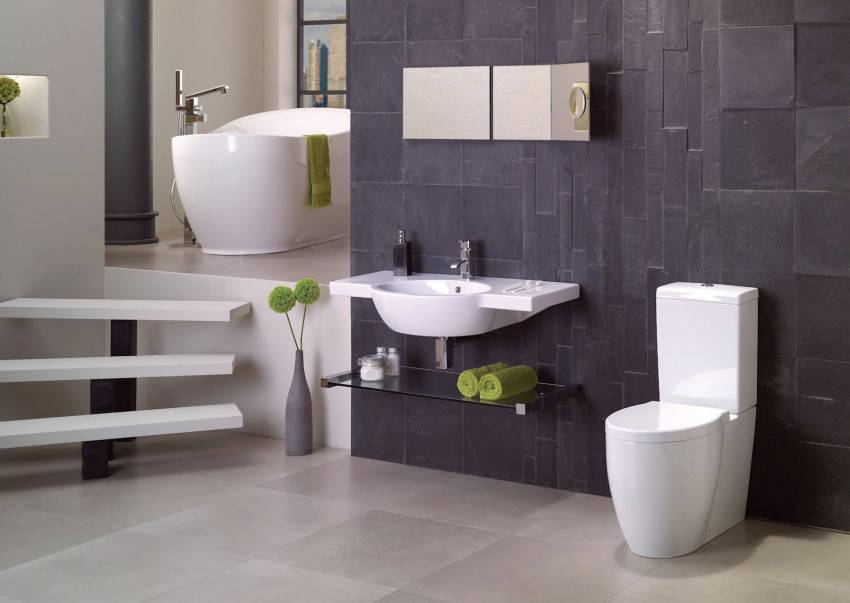 В компактных ванных комнатах лучше применяйте материал с глянцевой глазурованной поверхностью.