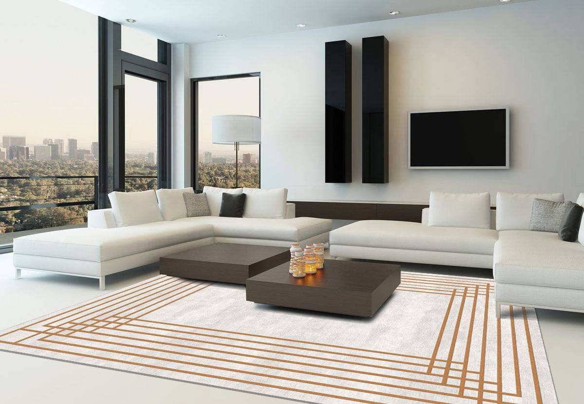 Начнем с пола. Мы уже упоминали, что укладку нужно производить поперек. Но допускается и диагональное размещение планок или плиток, это также меняет форму узкой гостиной в лучшую сторону. Дополнить эффект поможет ковер — либо с горизонтальным поперечным рисунком, либо однотонный, постеленный вдоль короткой стены.