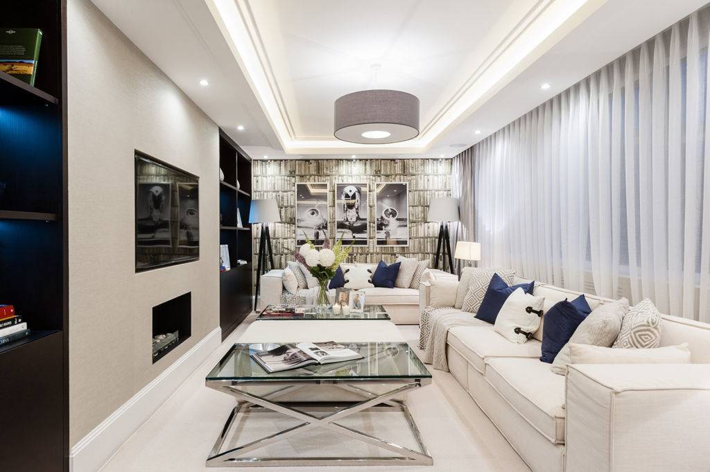 На фото узкий зал в современном классическом стиле
