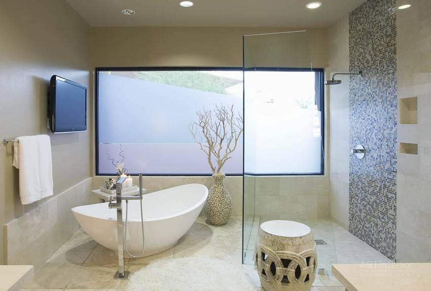Средиземноморский стиль – обязывает применять песочную и бирюзовую гаммы, приветствует отделку плиткой и вместительные купальни.