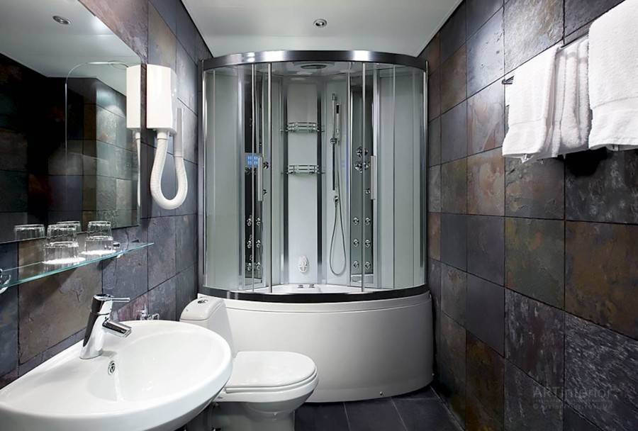 Душевая кабина. Кто-то ставит отдельно, кто-то нет. Если такая необходимость имеется, можно подобрать компактный вариант, выглядят они очень стильно.