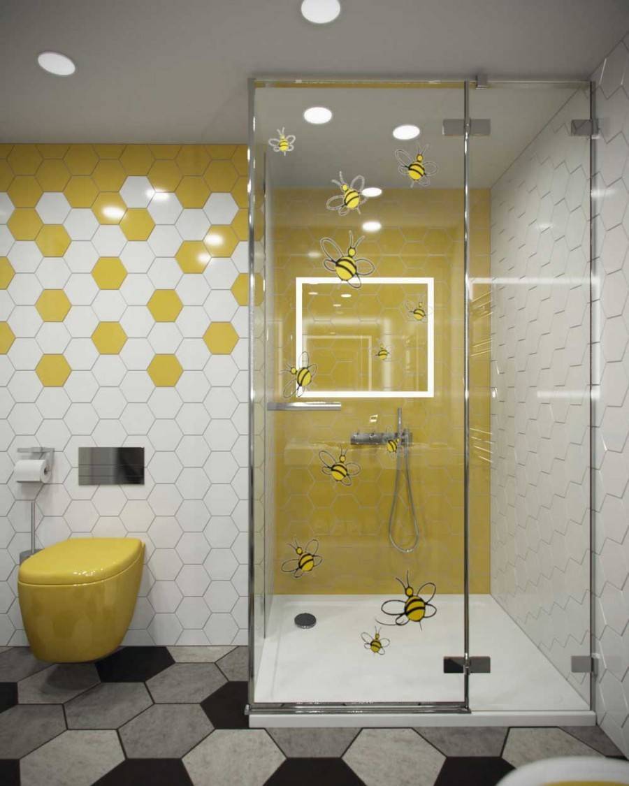 - стены отделаны плиткой горчичного цвета, имитирующей кирпич; стена, по которой расположена ванна, облицована полностью, другие стены — на половину высоты, выше стены окрашены светло-бежевой краской;