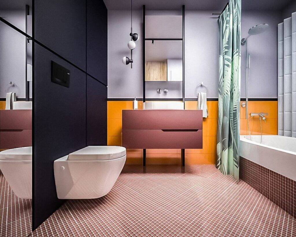 Отделка банных зон яркой плиткой сделает весь интерьер ярким. Центральную часть ванной комнаты с умывальником можно затем подчеркнуть темным элегантным мрамором или керамическим деревом. Эффект в любом случае будет впечатляющим.