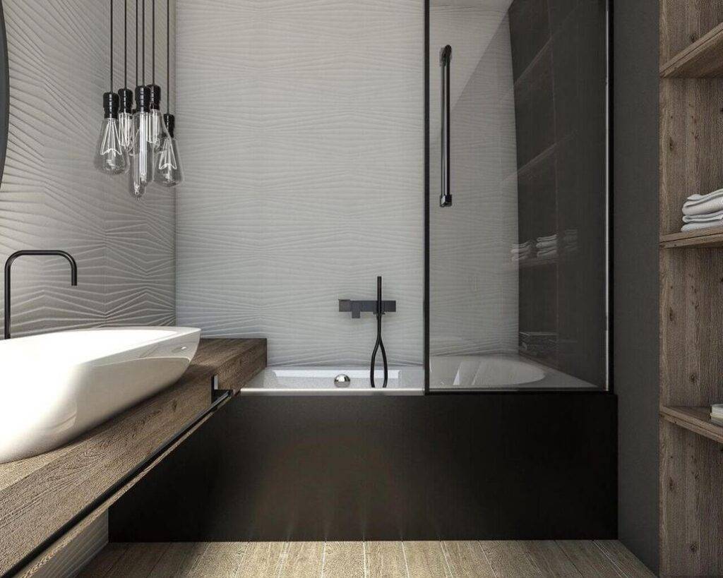 Здесь хорошо подойдет как гладкая, так и структурная плитка с разной степенью глянца. Добавление светлого дерева (например, в виде тумбы под умывальник), а также немного бежевого оттенка в зоне туалета делают интерьер еще более приятным для глаз.