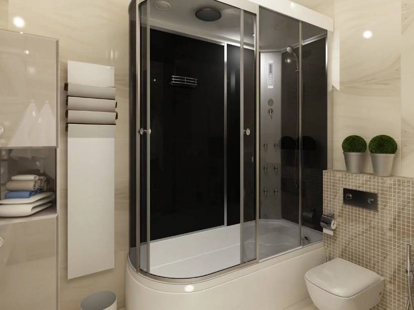 Такая конструкция совмещает в себе функции душа и ванны: это может быть как чаша, оснащенная лейкой, так и полноценный душевой бокс с высоким поддоном и дополнительным оборудованием. Подходит только для просторных комнат, так как занимает много места. Встречаются и встроенные в ниши душевые, которые закрывают распашными или раздвижными дверями.
