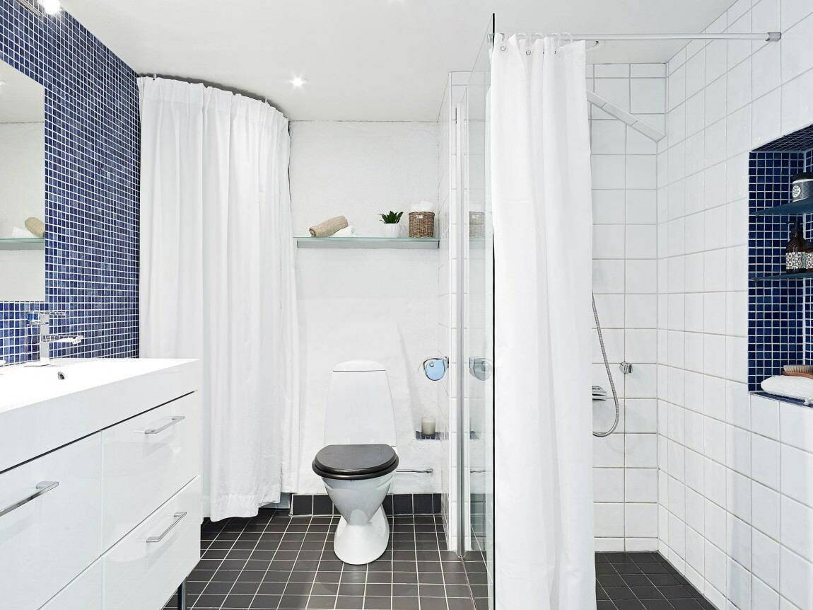 Еще один стильный вариант — это популярный сейчас скандинавский стиль. В дизайне душевой он будет очень похож на минимализм, разница лишь в том, что сканди не пренебрегает яркими цветами и аккуратными орнаментами. Здесь можно использовать ненавязчивую мозаику и яркий текстиль.