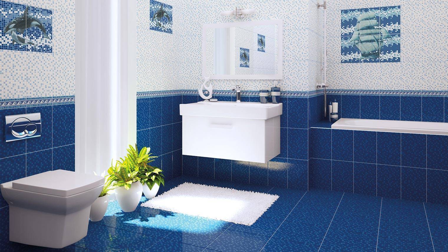 Синий цвет относится к холодным, поэтому его рекомендуется разбавлять более теплыми (золотистым, желтым, оранжевым) тонами, которые можно использовать в элементах декора или рисунках на кафеле.