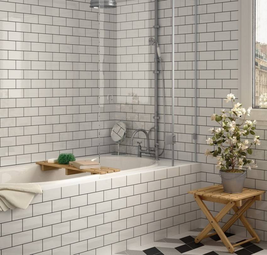 Белый классический кафель можно неплохо разбавить плиткой со структурой плетения. Для этого подбираются модели облицовки с контрастными оттенками. Если очень нужно отделить нижнюю зону от верхней, необязательно использовать подходящие бордюры. С этой задачей хорошо справится стеклянная миниатюрная плитка для ванной.
