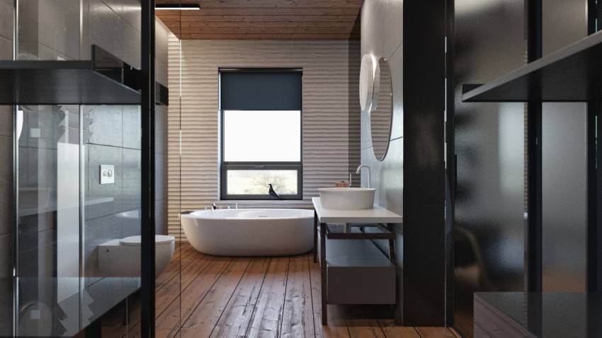 Занавески тоже могут быть разными, главное, чтобы сочетались стилю. Это простые японские (римские) шторы при минимализме в одном тоне с полом. Подойдут и разнообразные жалюзи в ванную с окном в частном доме. Это очень удобно, всегда можно регулировать уровень освещения в разное время суток. К тому же они легки в уходе.