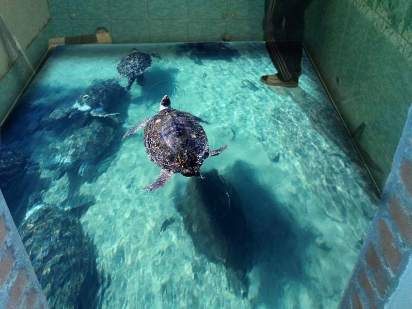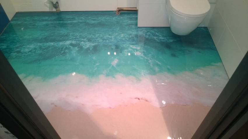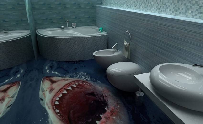 В современном интерьере ванны оригинально смотрятся наливные полы с 3-D эффектом. Специалисты не советуют делать подобное в очень маленьких помещениях, чтобы ощутить глубину изображения требуется некоторый простор.