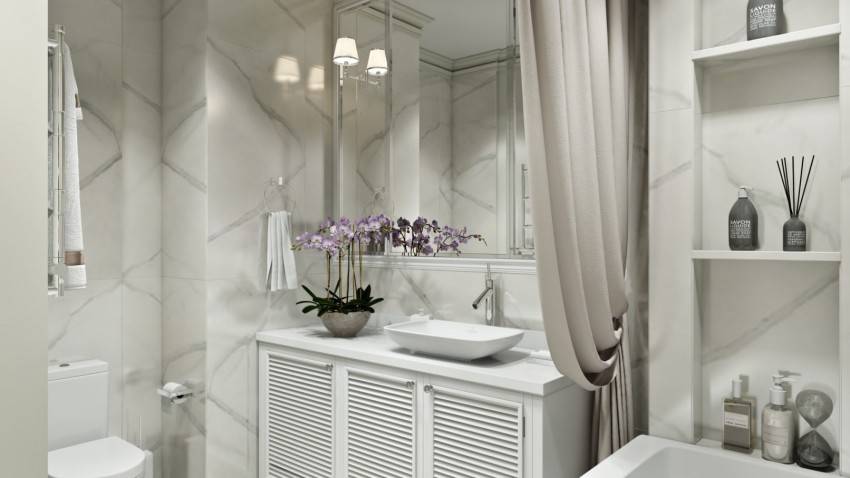 А если хотите разбавить белый цвет другим способом, то подойдет белый мрамор с розовыми, серыми или голубыми разводами. А чтобы ванная комната не выглядела как палата в больнице, можно одну из стен закрыть деревянными досками.