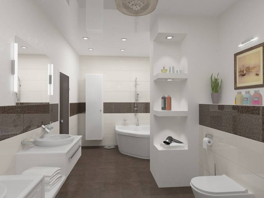 Если хочется выбрать кафель бежевого цвета, а мебель в шоколадных тонах, главное не переборщить, чтобы в комнате не возник эффект черной дыры.