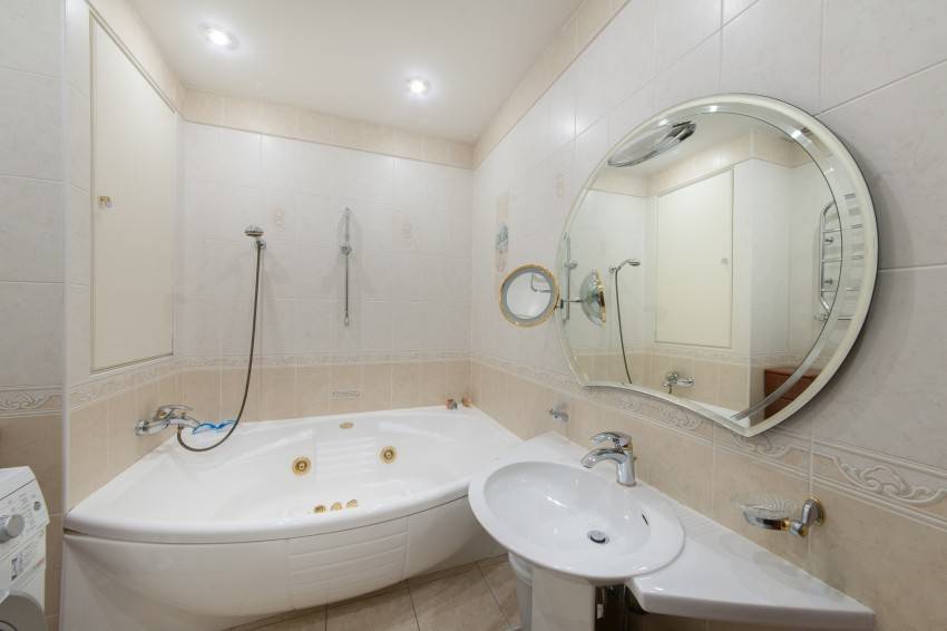 интерьер ванной комнаты в бежевом цвете, оформленной в классическом стиле