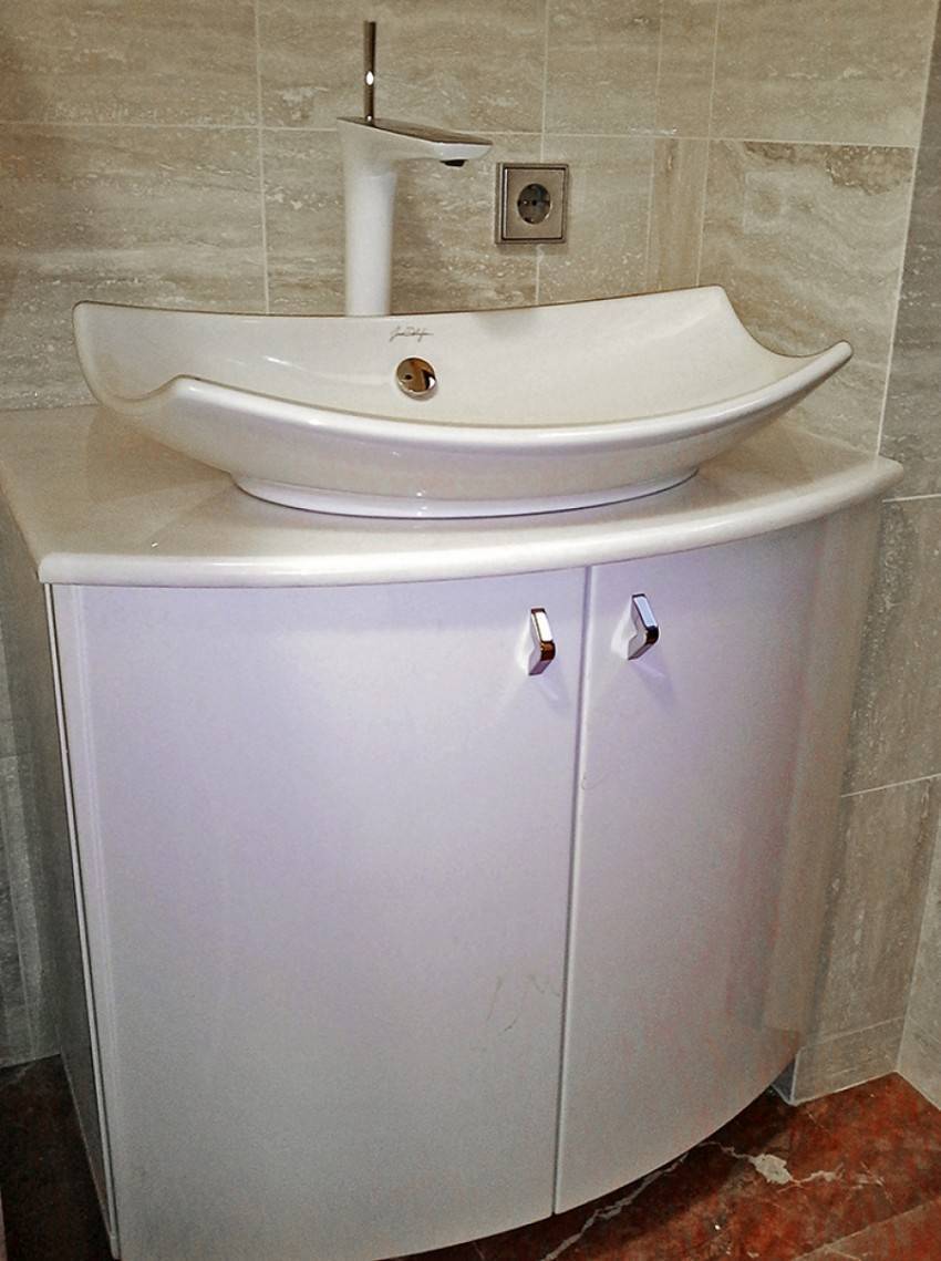 Умывальник самых простых форм или раковина-чаша, овальная, круглая или прямоугольная, смесители однорычажные, встроенные в стену. Приветствуются столешницы.