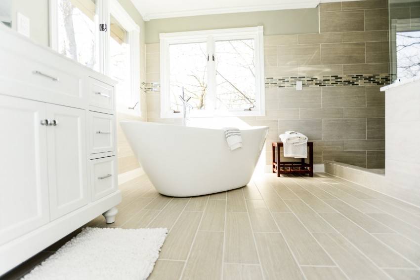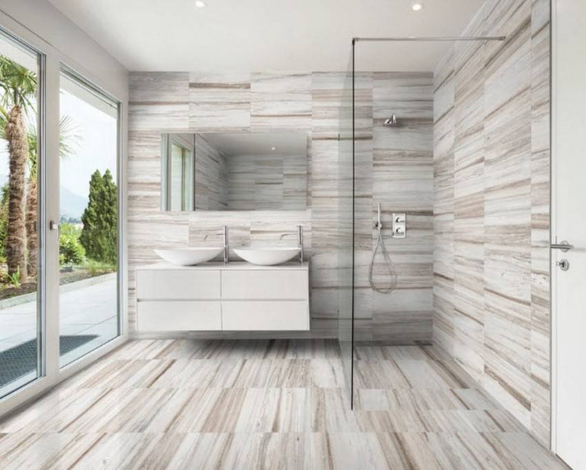 Деревянные полы не годятся для ванной, иногда используется специальный ламинат или линолеум. Практичнее и надежнее – наливные полы, керамогранит либо искусственный камень с фактурной поверхностью, чтобы не скользила. Но самый простой вариант – это плитка, только выбирай именно напольные коллекции, которые толще, прочнее и долговечнее.