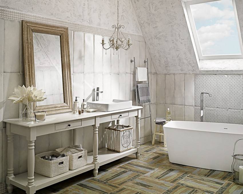 Керамическая плитка синего цвета, а также стилизованная фурнитура и смесители для ванной идеально подходят для этой эстетики. В продаже также имеются керамическая плитка и другие виды напольной плитки, которые выглядят так, словно на них повлияло бремя лет. Они дороже, чем стандартные, но в этом стиле они отлично подойдут к ванной.