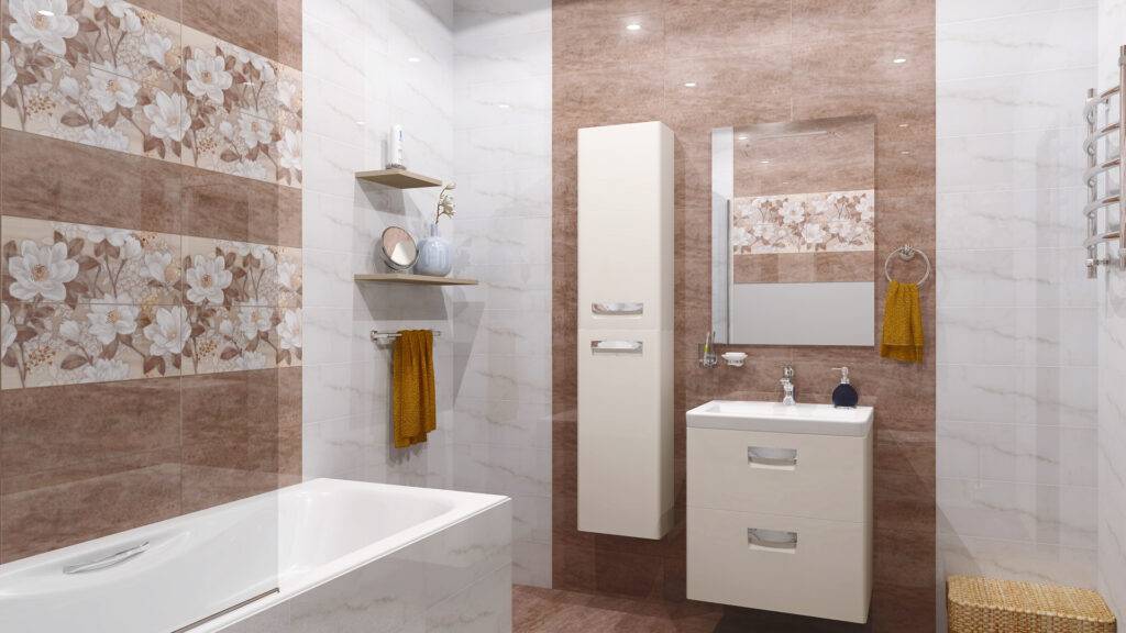 Плитка данной расцветки, как правило, имеет несколько оттенков, чтобы у покупателя был максимально широкий выбор для воплощения своих идей по оформлению интерьера. Рассмотрим различные варианты светло-коричневой плитки для ванной комнаты: