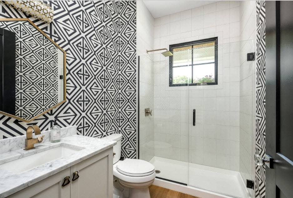 Существует много способов обустроить ванную комнату в данном стиле. Сочетание цветов используется на контрасте, часто применяется разделение помещения на зоны при помощи декоративных перегородок.
