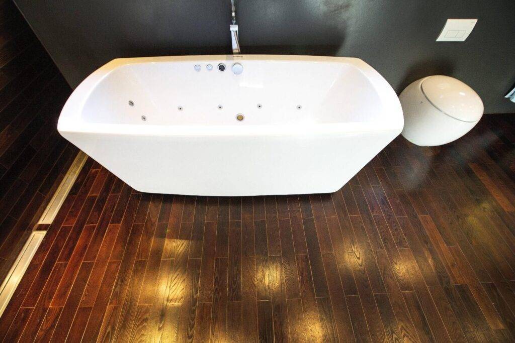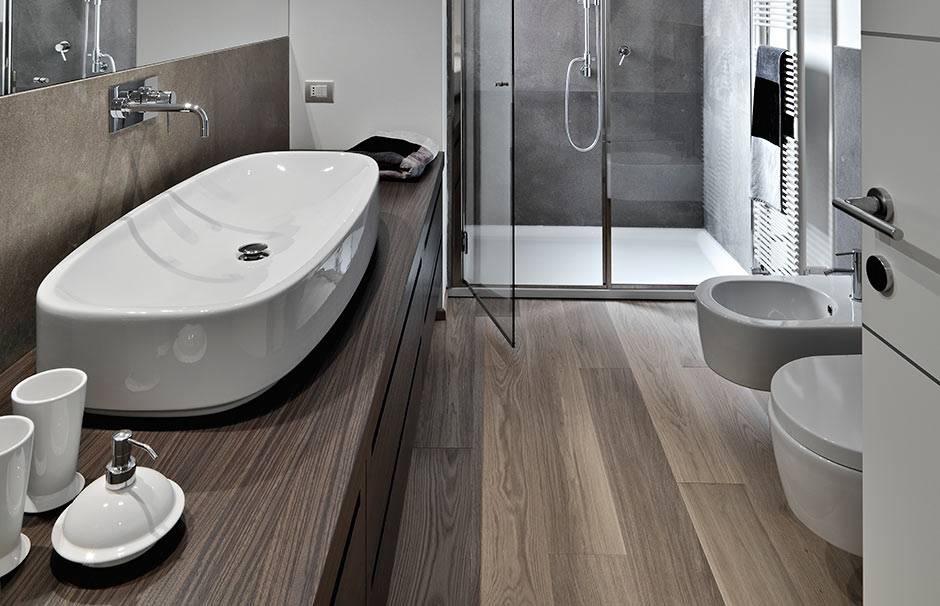 Дизайн ванной комнаты под дерево подразумевает и соответствующее напольное покрытие. Кроме высокого уровня влагостойкости, для напольного покрытия очень актуальна его прочность и защита от деформаций: