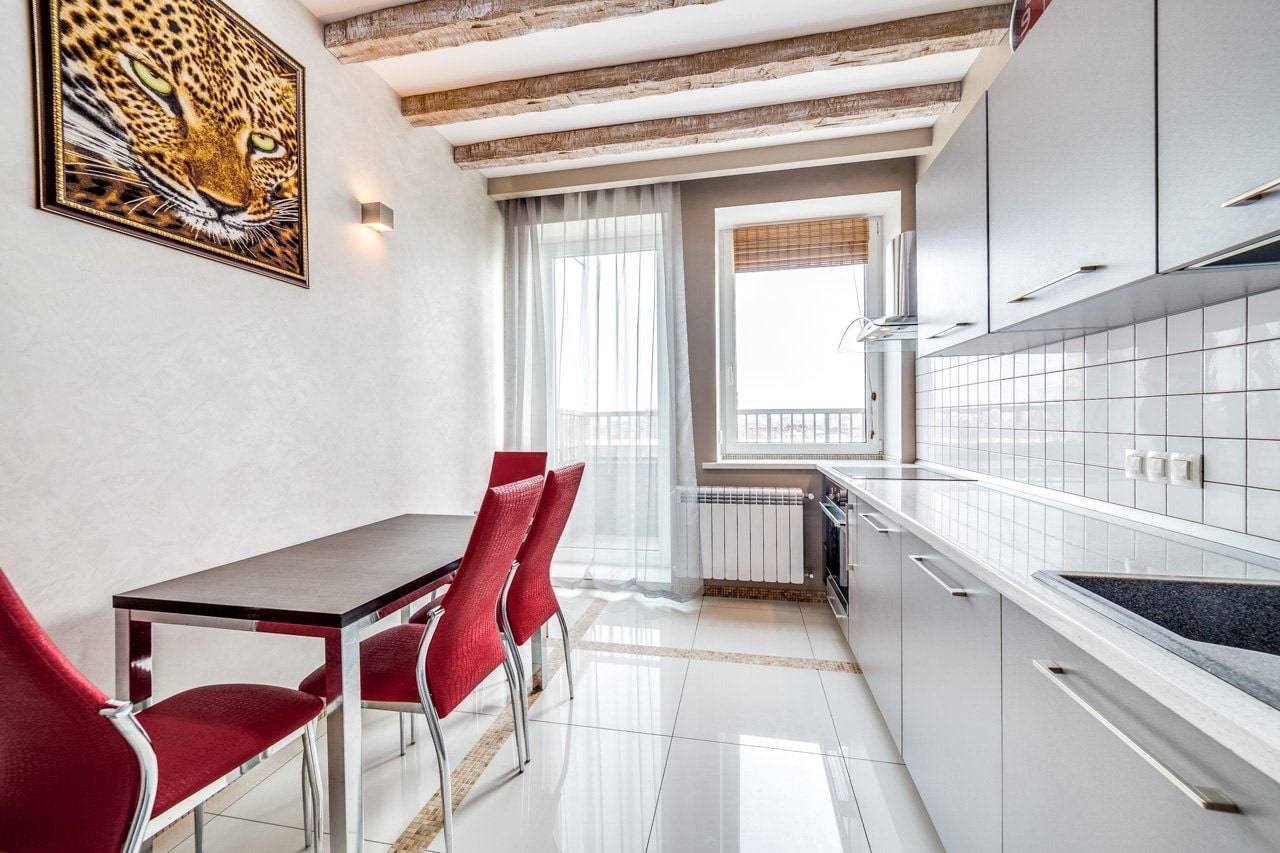 Радиатор допустимо убрать в другое место или перенести в сторону. Допустимо разделить кухню и балкон с помощью барной стойки. Если балкон довольно большой, нетрудно использовать его как полноценную столовую, зонировав пространство занавеской или установить арку.