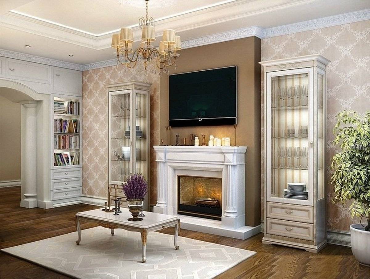 Классический стиль требует дополнительного декорирования гостиной. Это могут быть подсвечники, молдинги, колонны. Мебель для зала в квартире следует выбирать из массива, фотопримеры помогут подобрать интересный вариант. Стиль предполагает размещение каминной зоны и желательно развесить на стенах картины в багетных рамах.