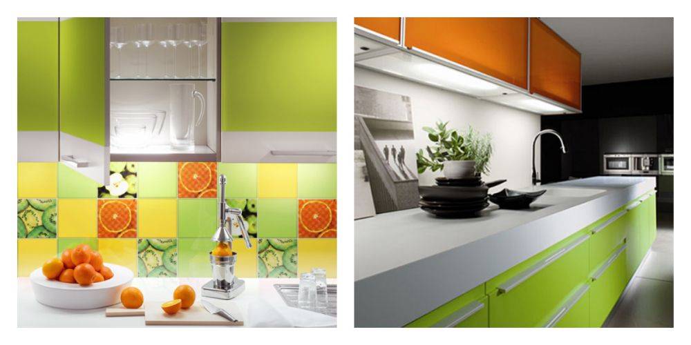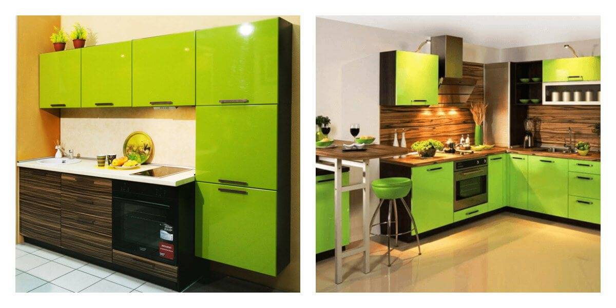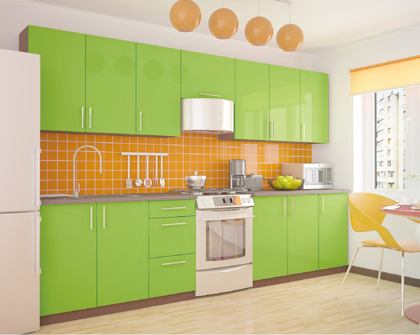 Глянцевая бело-зеленая гамма с актуальными оттенками лайма, изумрудного, лимонно-зеленого или салатного цвета подчеркивает современность и практичность кухни в техно стиле или минимализме. Яркая сочная гамма отлично нейтрализуется белым цветом и серыми тонами деталей.