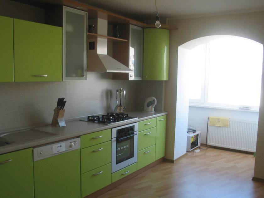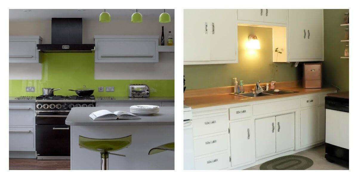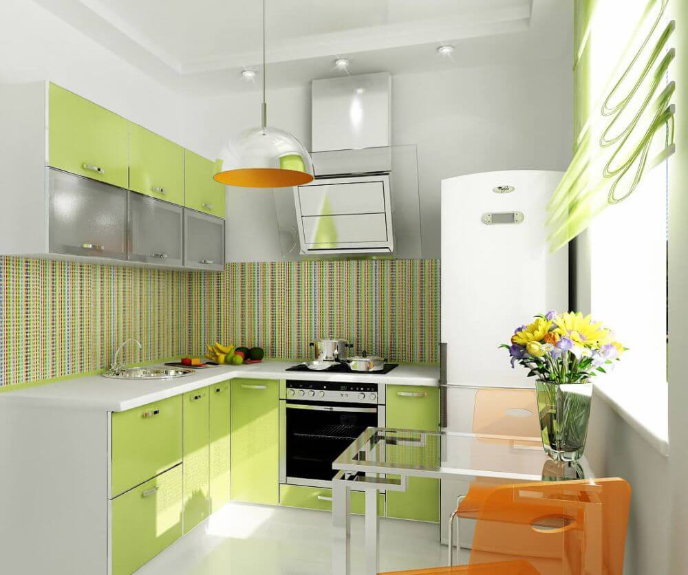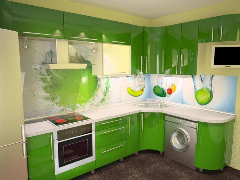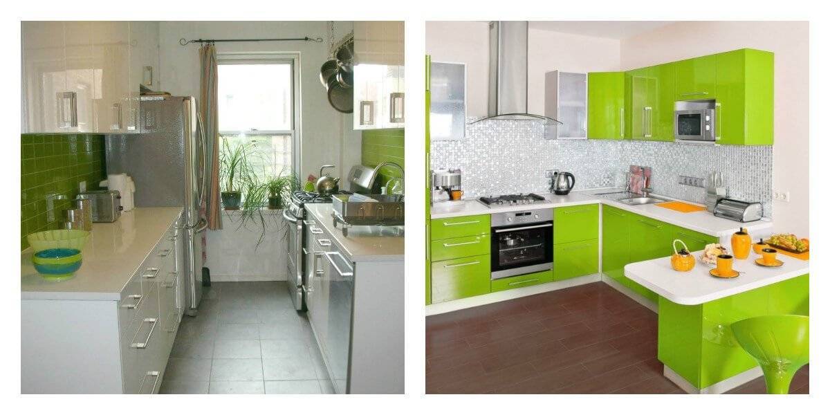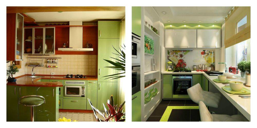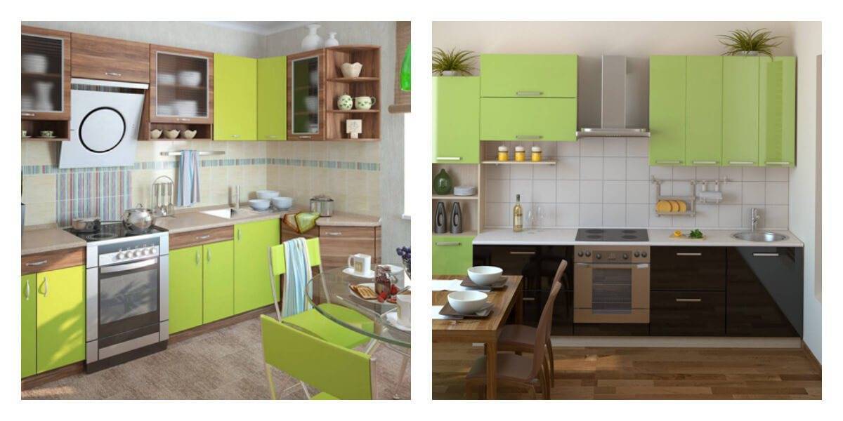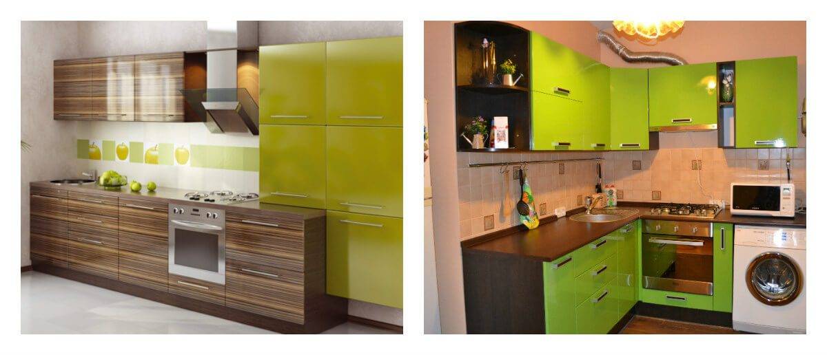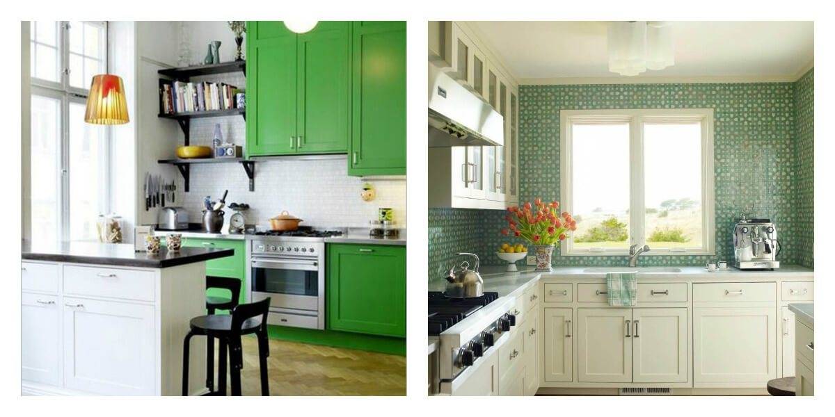 Небольшой кухне подходят светлые оттенки гарнитура: нежно-зеленый, фисташковый. Темные оттенки кухонной мебели в миниатюрном помещении могут создать угнетающую обстановку. При этом учитывайте то, что зеленый гарнитур подходит белым или бежевым стенам.