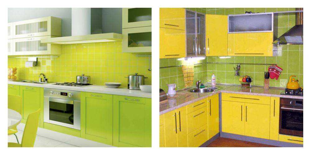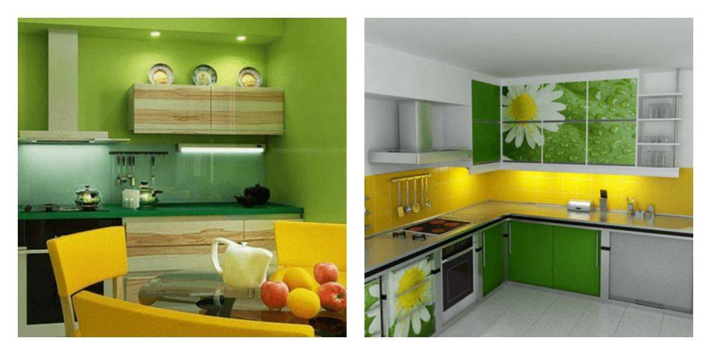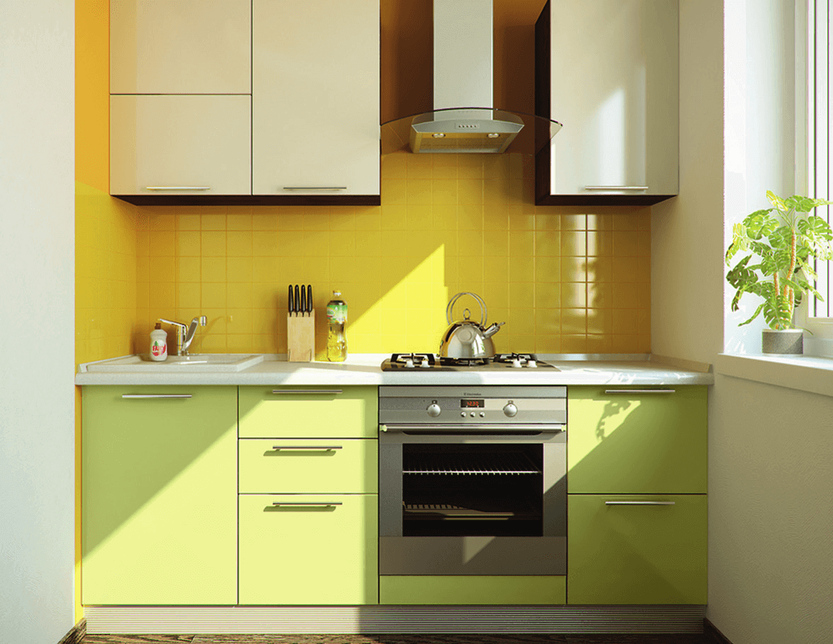 Зеленый цвет – это цвет умиротворенности, гармонии, единения с природой. Более жизнерадостной кухню делает сочетание зеленого цвета с желтым.