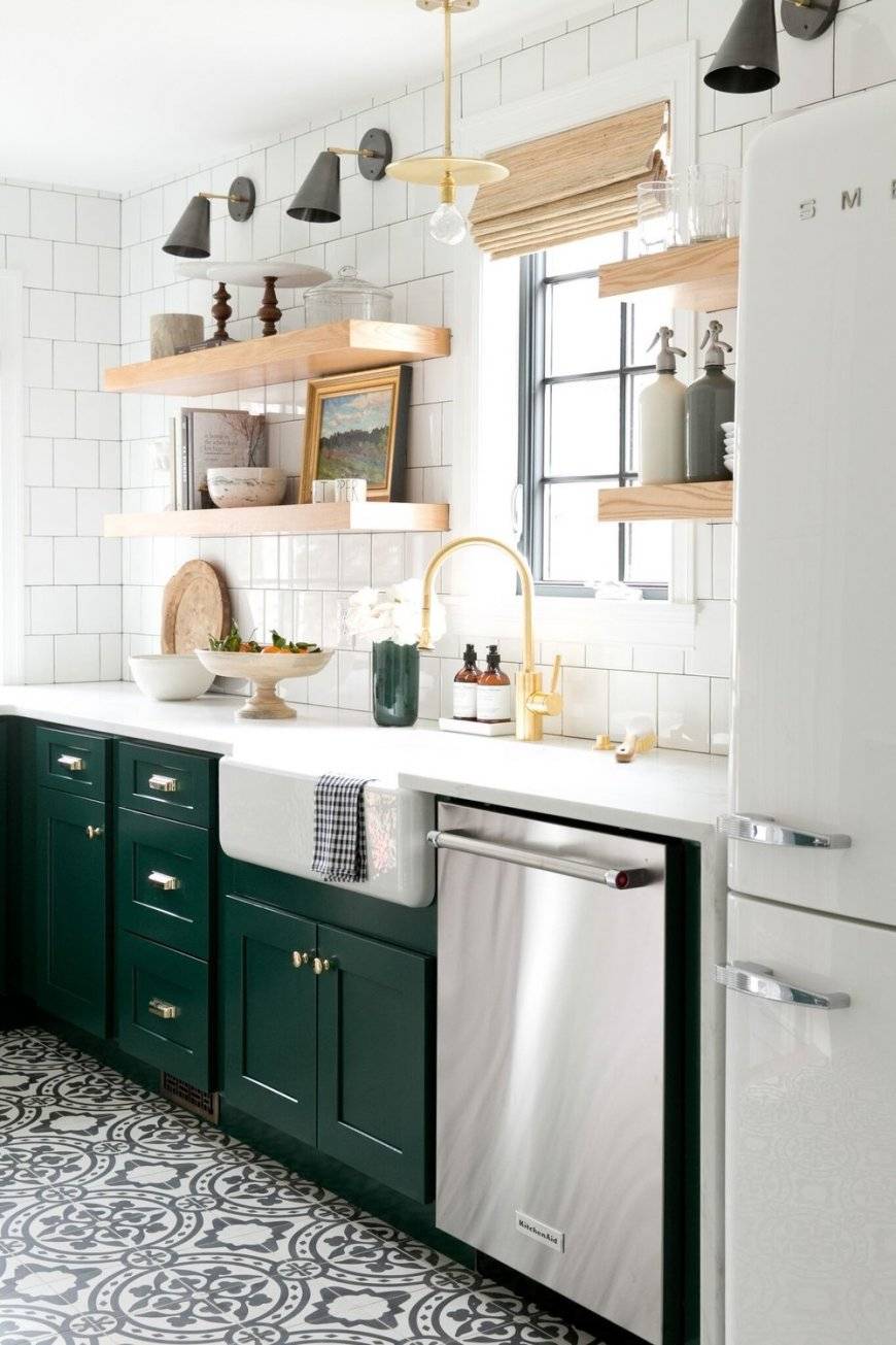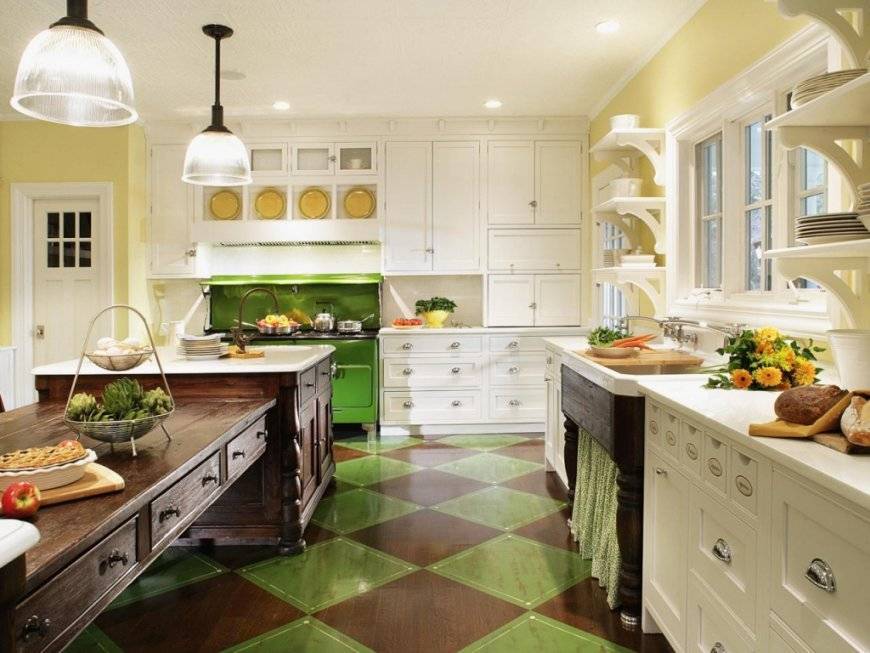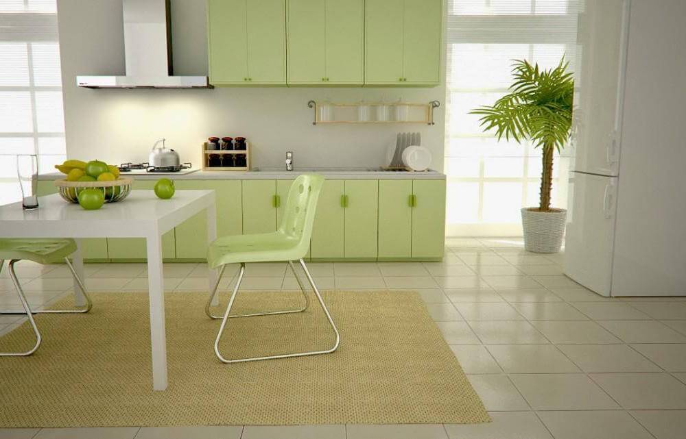 Зеленый допустимо применять в интерьере в небольших количествах – для оформления фартука, люстры, картин. В этой же палитре делают жалюзи. Пол допустимо выкладывать керамогранитом. Однако гораздо лучше будет выглядеть наливной пол. Он должен быть выполнен в темной гамме.