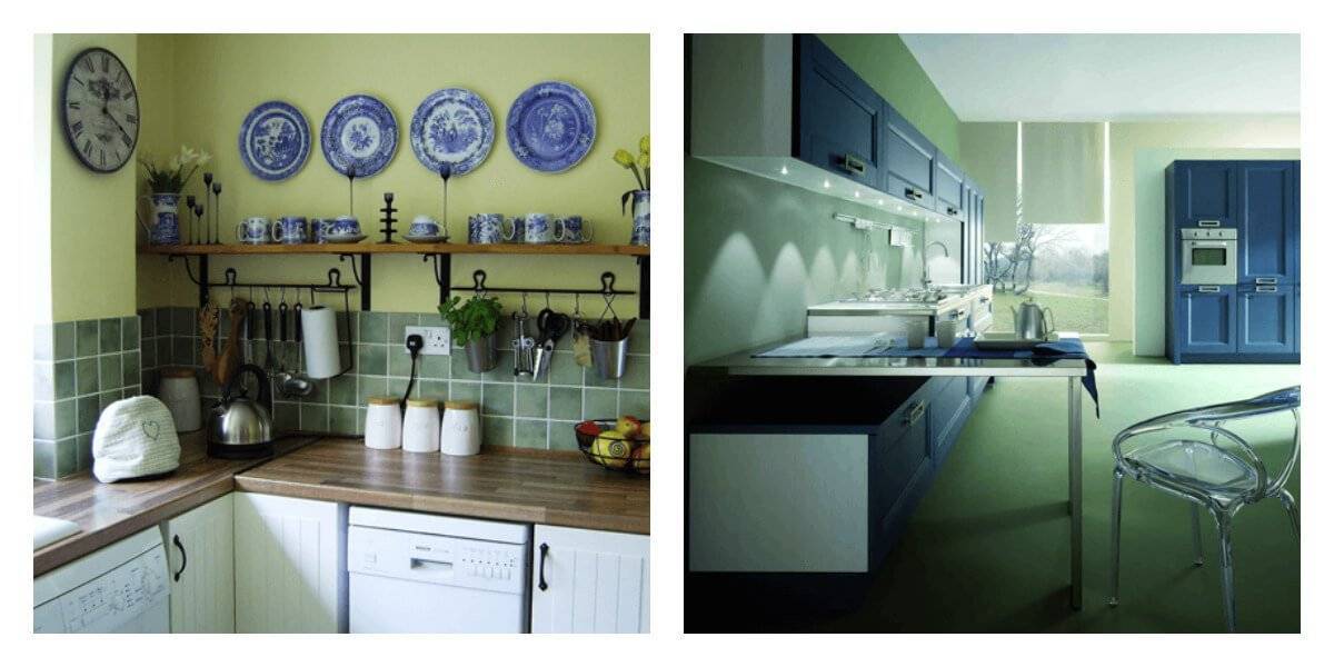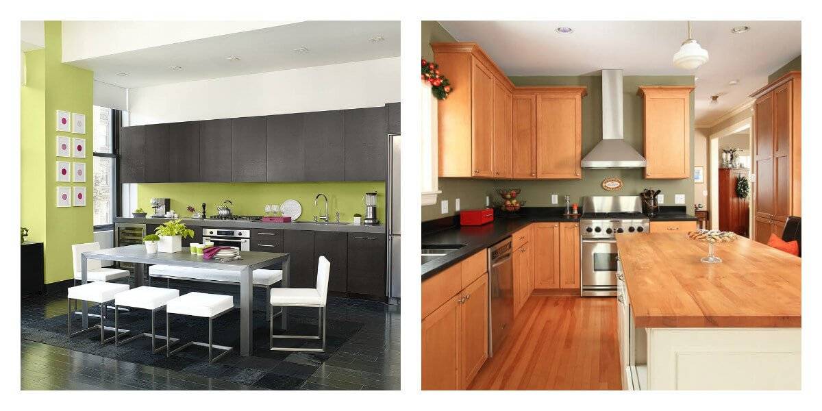 Для зеленой кухни необязательно выбирать акценты из других цветов для зеленой кухни. Различные оттенки зеленого, при условии удачного подбора, будут выглядеть очень необычно, но в то же время гармонично. Но если хочется разбавить зелень чем-то еще, то существует несколько беспроигрышных комбинаций. Они подойдут для любого оттенка зеленого.