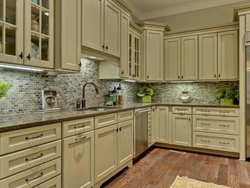 Бежевый цвет прекрасно подходит ля оформления стен. Но также, подобрав оттенок, его можно комбинировать в кухонном гарнитуре. Например, зеленые верхние модули и бежевые – нижние. Такой переход сделает кухню более нежной, мягкой.