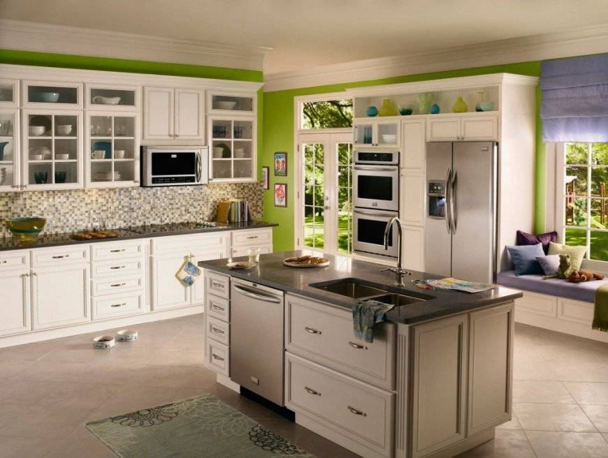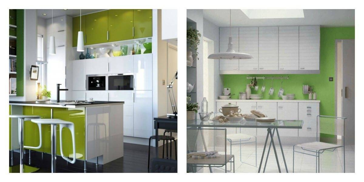 Бело-зеленый оттенок на кухне широко применяется во всех стилевых направлениях. Изменяется только цветовая палитра. Для современных интерьеров применяются сочные яркие цвета, для классических – нежные пастельные тона.