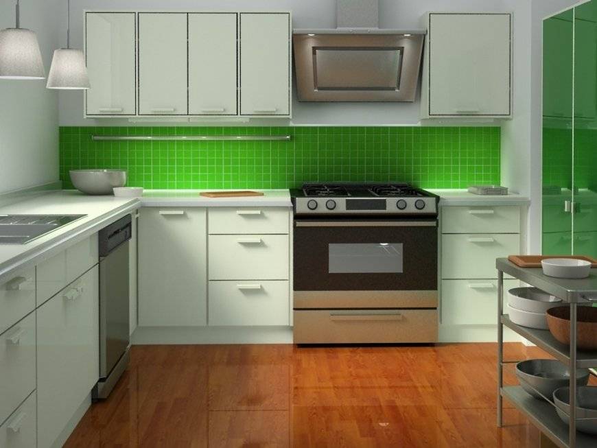 В качестве покрытия для стен можно использовать моющиеся зеленые обои или моющуюся краску. Такие варианты лучше всего подходят для кухни, постоянно подверженной загрязнениям.