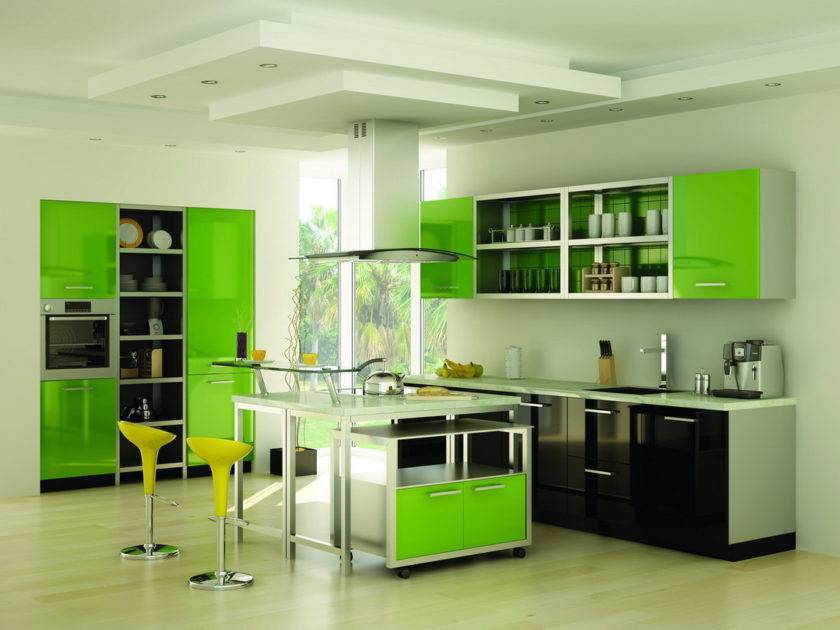 Этот стиль характеризуется простотой и функциональностью. Создать такой интерьер легко. Для этого стоит купить современный гарнитур. Он должен обладать глянцевой поверхностью. Большой популярностью пользуются оливковые и малахитовые тона. Аналогичные цвета подойдут для декора и текстиля. В отдельных случаях уместным вариантом станет применение зеленой бытовой техники.