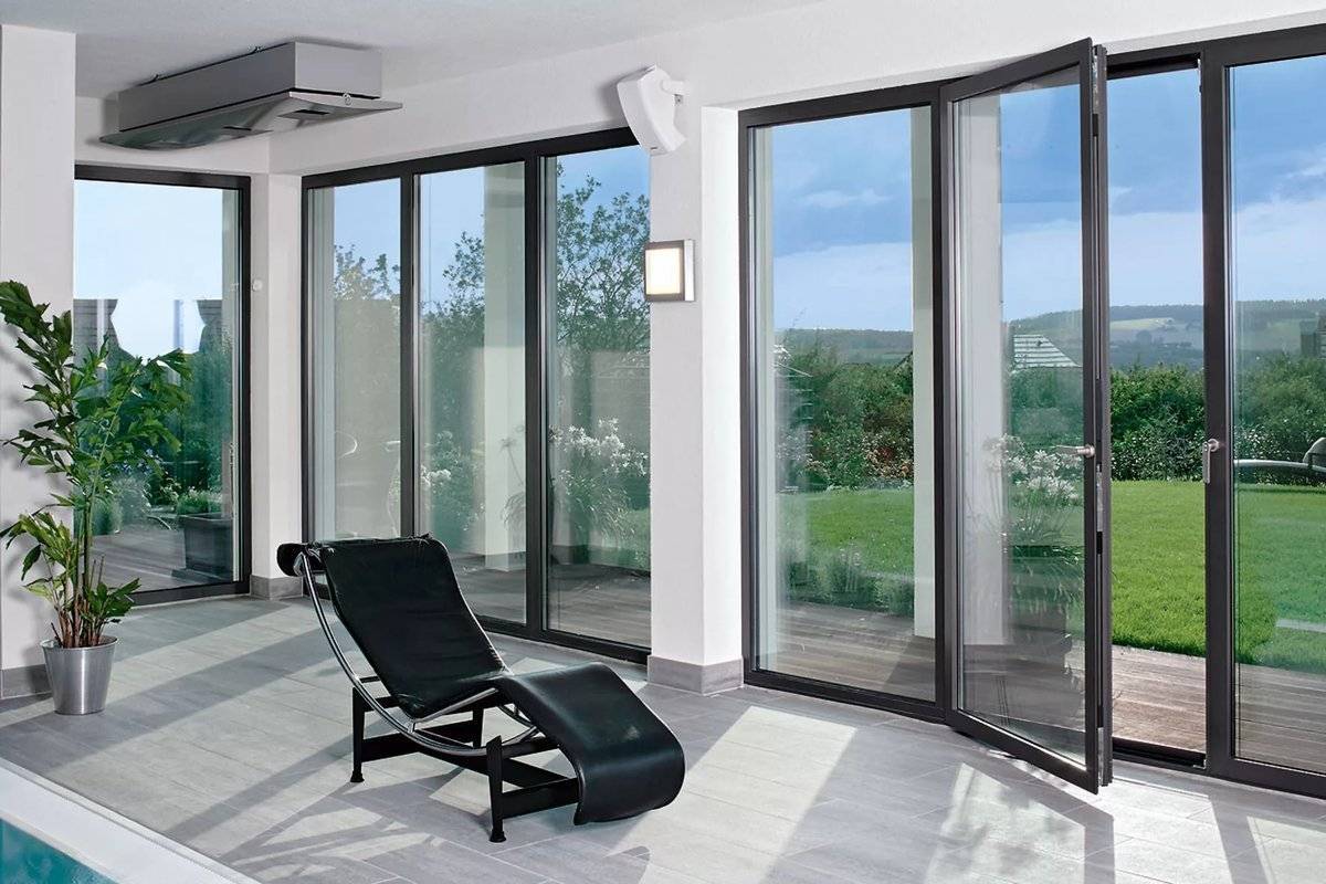 - Складные. Панорамные окна могут складываться по типу книжки. Задействованы могут быть 5-6 створок. При установке таких окон/дверей можно комнату превращать в открытую террасу. Сложили двери и комната превратилась в часть террасы