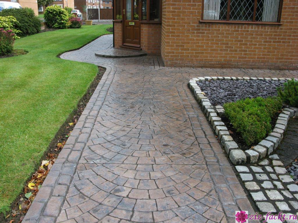 - Бетонные дорожки можно сделать цветными с помощью специальных колеров, а также украсить кусочками стекла и керамики, создавая эффект мозаики. Иногда, чтобы создать оригинальную идею, достаточно всего лишь прочертить острым прутом бороздки по краям бетонных дорожек, или же нарисовать на поверхности имитацию брусчатки (подобного рода рисование нужно проводить не раньше чем через день после заливки бетонной смеси).