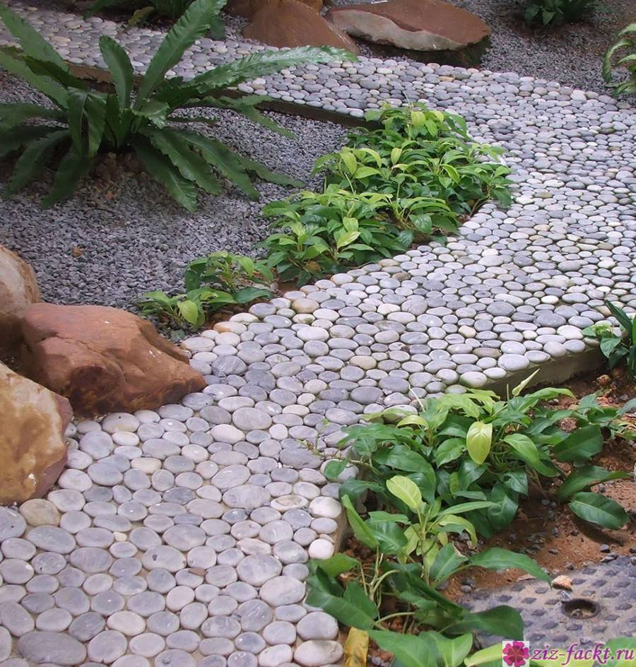 Еще одним весьма романтичным вариантом обустройства становится морская галька. Только хороша она исключительно при соблюдении размеров – если камешки больше 2 см в диаметре, то ходить по ним будет сложно не только на шпильке, но и в кроссовках.