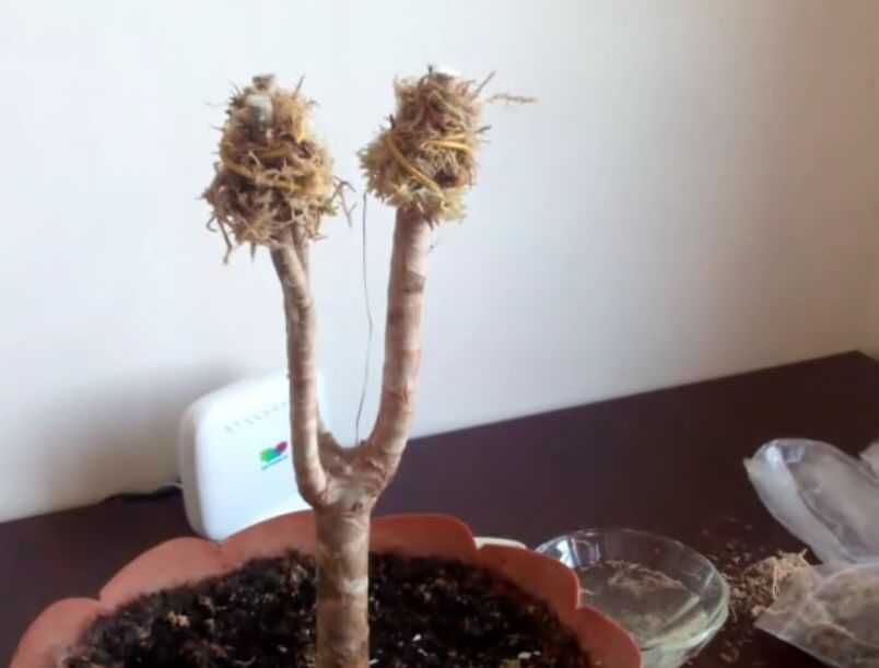 Для хорошего прорастания новых побегов, мох не снимают, а растение регулярно поливают, не допуская застоя влаги в горшке. Для этого лучше использовать полив в поддон, главное, чтобы растение находилось на свету, тогда боковые побеги быстро начнут прорастать. После появления побегов пленку можно снять, а драцена может продолжать рост без дополнительных манипуляций.