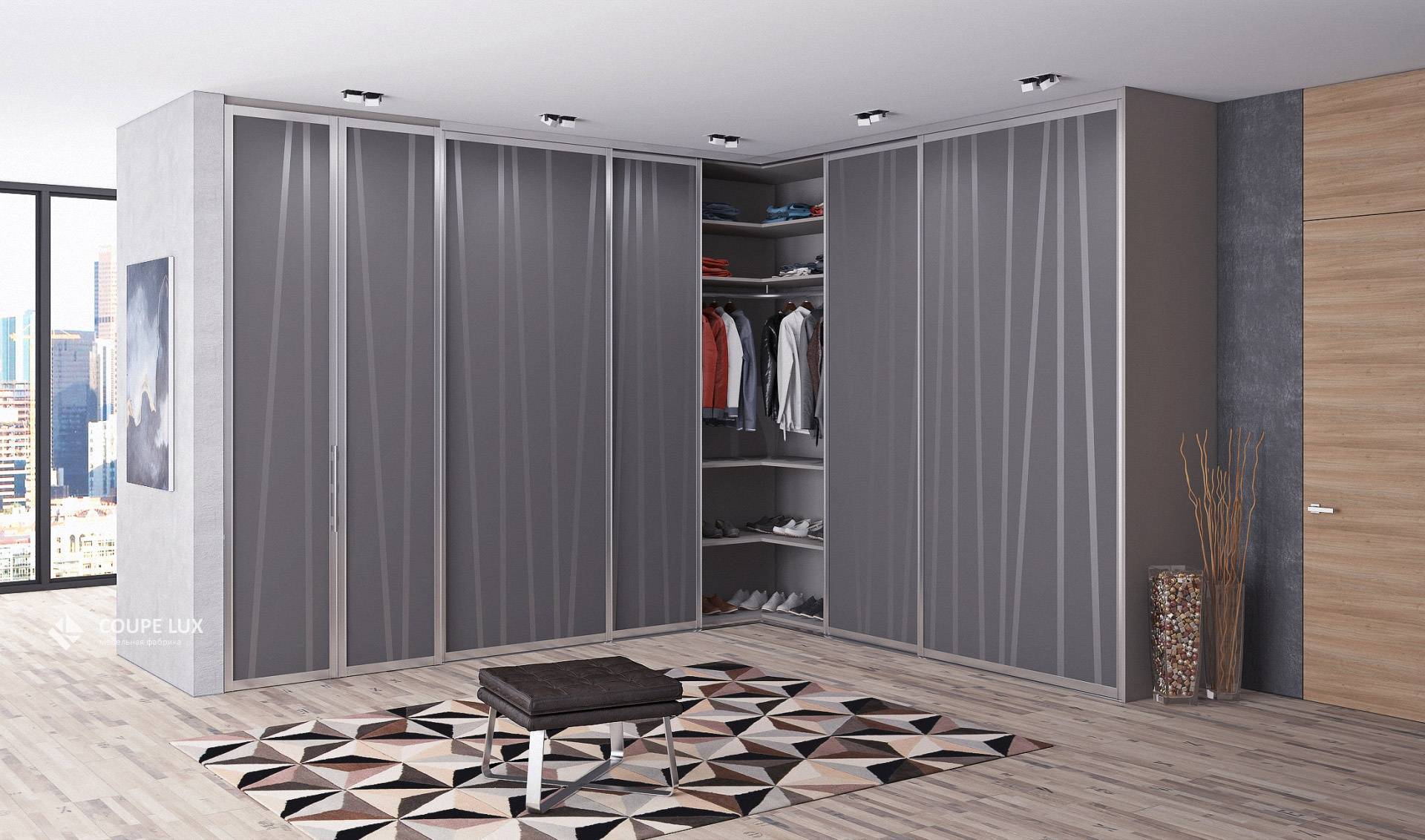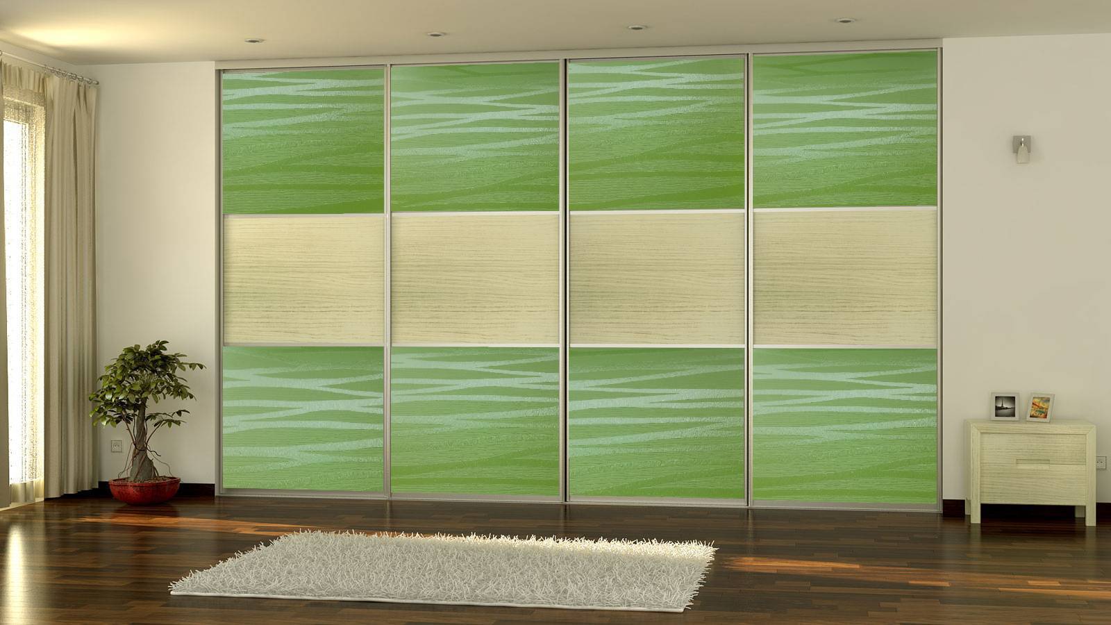 - стекло – для изготовления шкафов купе чаще используют матовое стекло или акриловые стеклянные дверцы. Прозрачные модули непрактичны, по крайней мере, для шкафов с вещами, так как все содержимое легко просматривается. Отличной альтернативой обычному стеклу будет лакомат (матированная поверхность, позволяющая при приближении сориентироваться в пространстве) и лакобель (лакированное стекло с глянцевой поверхностью, часто разных цветов);