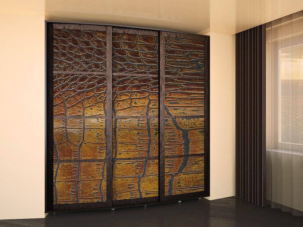 - кожа – такие изделия выглядят дорого и строго, поэтому подойдут больше для кабинета или другого официального помещения. Хотя можно подобрать нейтральный оттенок, скажем, змеиной фактуры и поставить такой шкаф в спальню. За кожаной поверхностью легко ухаживать;