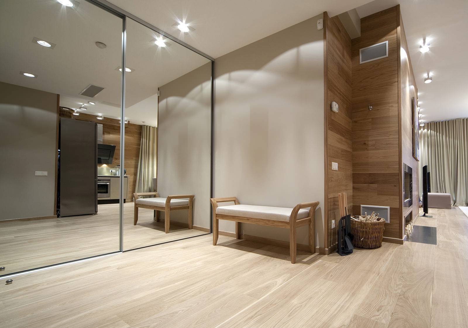 В гардеробную можно установить любую конструкцию. Всё зависит от площади огораживаемого пространства и желания владельцев. Поверхность дверного полотна в гардеробной, как правило, зеркальная.