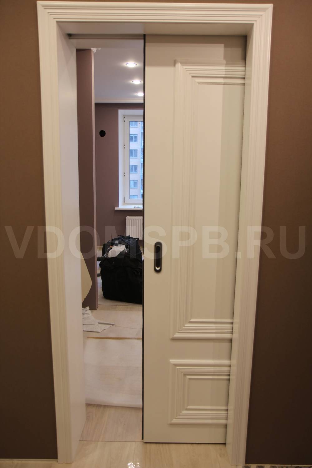 Раздвижная. Дверной короб монтируется таким образом, чтобы полотно при открытии пряталось внутри стены. Такой вариант удобен тем, что не задействуется окружающее пространство, но при этом нужны довольно толстые стены и участие профессионала при монтаже.