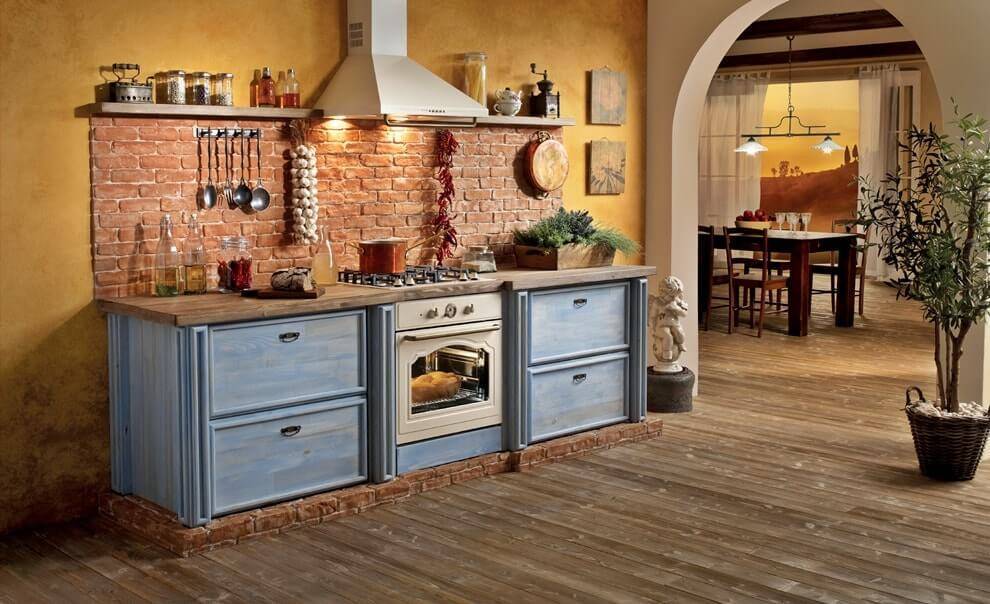 Второй вариант отделки стен – покраска. Если этот процесс подразумевает использование нескольких цветов, они должны гармонично сочетаться между собой. Например, можно выкрасить стену в оранжевый и синий, бежевый и коричневый, желтый и зеленый цвета. В современном интерьере данного стиля нередко встречаются фрагменты кирпичных стен, не имеющих дополнительной отделки. Это отличный способ дополнить обстановку квартиры элементами, подчеркивающими дух старины.