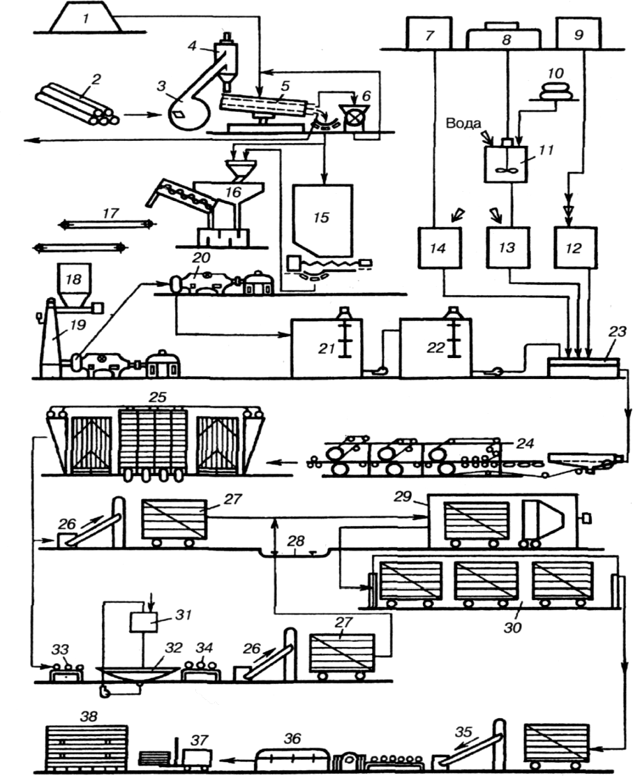 Рис. 3. Схема технологического процесса твердых и сверхтвердых плит: 1 – щепа; 2 – круглая древесина и кусковые отходы; 3 – рубительная машина; 4 — циклон; 5 – сортировка щепы; 6 – дезинтегратор; 7 – ёмкость для связующего; 8 – ёмкость для парафина; 9 – ёмкость для серной кислоты; 10 – мешки с эмульгатором; 11 – эмульсатор; 12; 13; 14 – расходные ёмкости соответственно для осадителя, парафиновой эмульсии и связующего; 15 – бункер щепы; 16 – установка для мойки щепы; 17 – ленточные конвейеры; 18 – расходный бункер для щепы дефибратора; 19 – дефибратор; 20 – рафинатор; 21 — рафинаторный бассейн; 22 – массный бассейн; 23 – ящик непрерывного проклеивания; 24 – отливная машина; 25 – пресс, 26; 35 – загрузочное и разгрузочное устройство; 27 — вагонетка; 28 – траверсный путь; 29 – камера термообработки; 30 – камера увлажнения; 31 — емкость для пропитывающего состава; 32 – пропиточная машина; 33; 34 – роликовые конвейеры; 36 – форматно-обрезная установка; 37 – электропогрузчик; 38 – склад готовой продукции