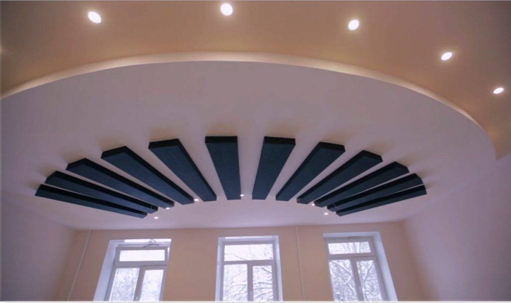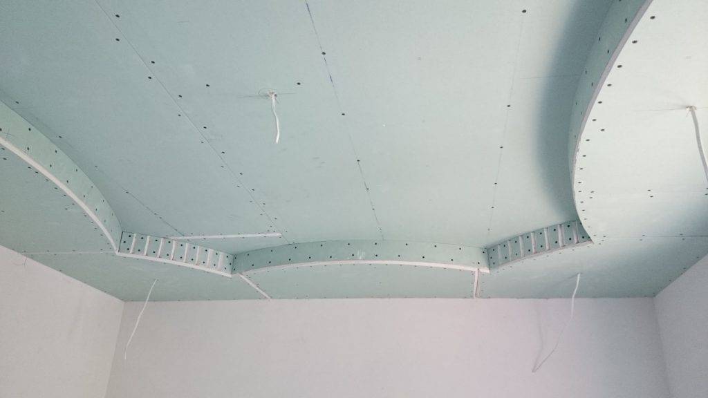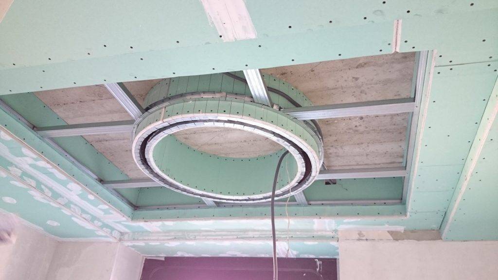 Система из нескольких уровней и выбранной фигуры создаётся на каркасе нужной формы посредством обшивки гипсокартоном