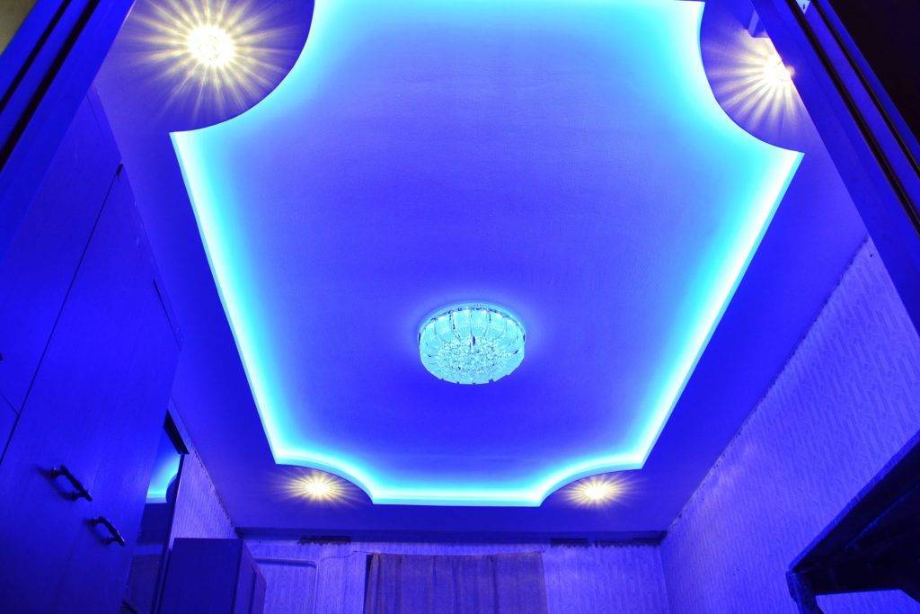 6. Монтаж двухуровневого потолка закончен. Остается финишная отделка шпатлевкой и подключения элементов освещения. Чаще всего используют светодиодные лампы или Led- ленты.