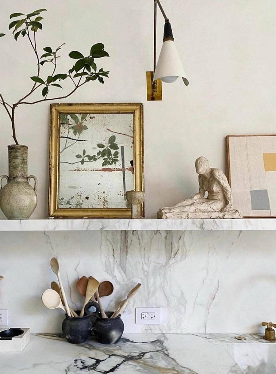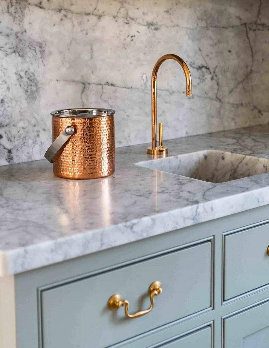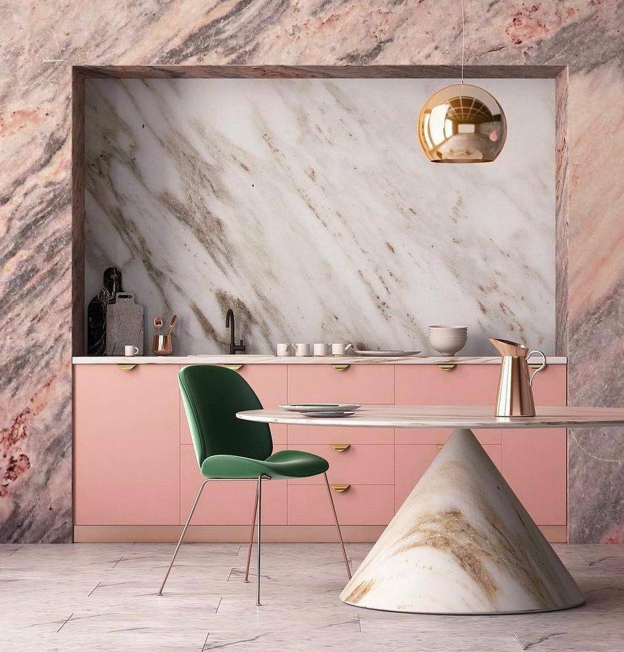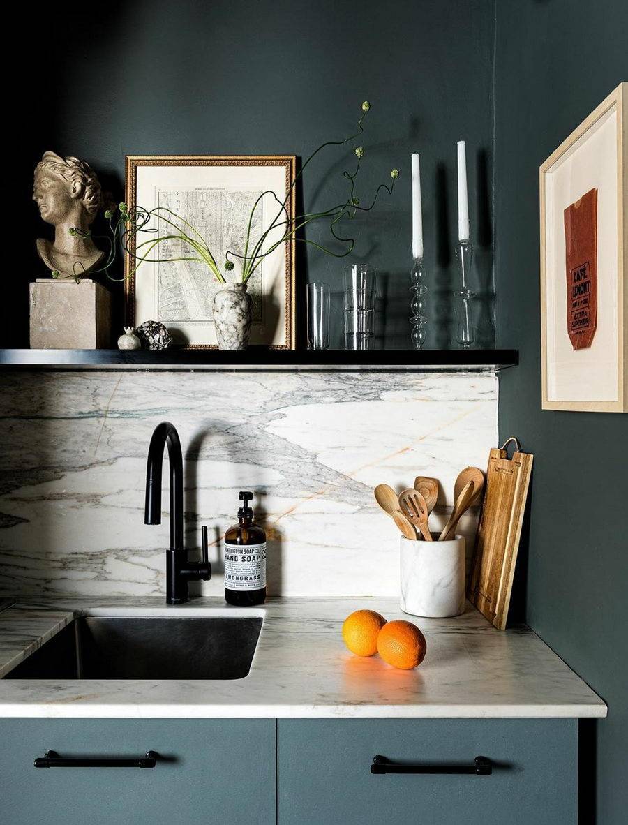 Мраморная столешница по контрасту подчеркнет красоту и глубину каждой детали рисунка. Имея такую насыщенного цвета облицовку, не стоит перегружать яркими акцентами интерьер — дом уже выглядит гармонично.